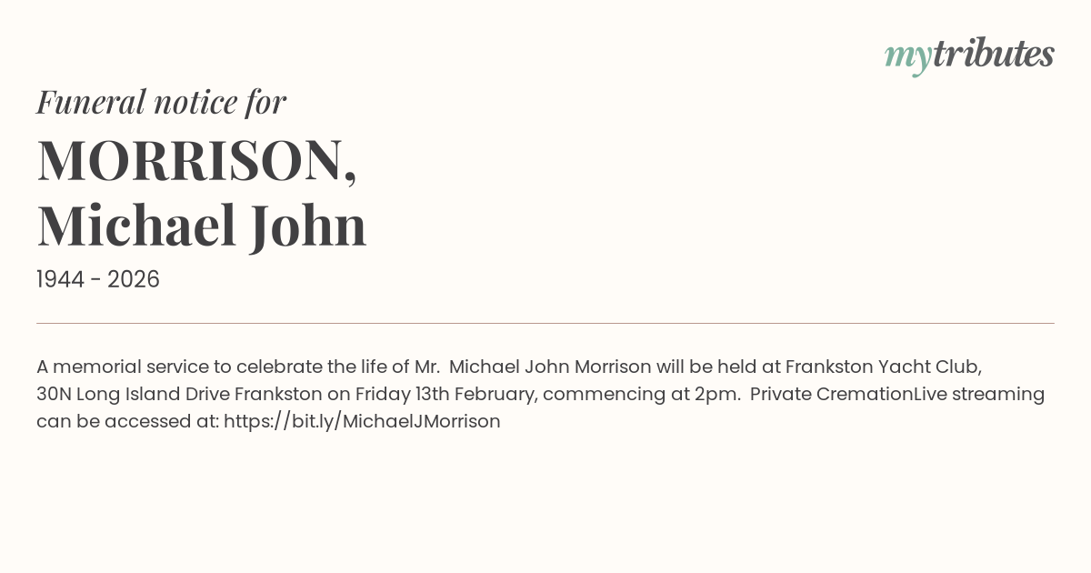 17°CA memorial service to celebrate the life of Mr. Michael John Morrison will be held at Frankston Yacht Club, 30N Long Island Drive Frankston on Friday 13th February, commencing at 2pm.