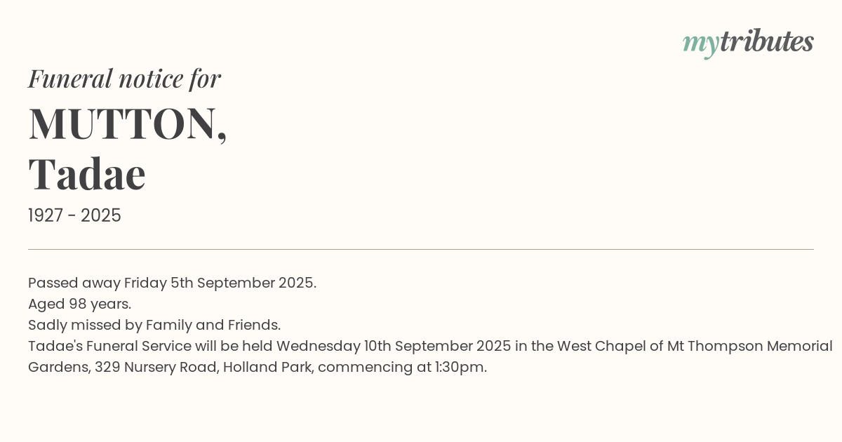 Tadae's Funeral Service will be held Wednesday 10th September 2025 in the West Chapel of Mt Thompson Memorial Gardens, 329 Nursery Road, Holland Park, commencing at 1:30pm.
