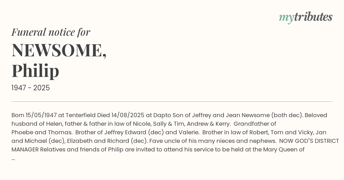 17°CBorn 15/05/1947 at Tenterfield Died 14/08/2025 at Dapto Son of Jeffrey and Jean Newsome (both dec). Beloved husband of Helen, father & father in law of Nicole, Sally & Tim, Andrew & Kerry. Grandfather of Phoebe and Thomas. Brother of Jeffrey Edward (dec) and Valerie. Brother in law of Robert, Tom and Vicky, Jan and Michael (dec), Elizabeth and Richard (dec). Fave uncle of his many nieces and nephews. NOW GOD"S DISTRICT MANAGER Relatives and friends of Philip are invited to attend his service to be held at the Mary Queen of Croats, 7 Bellevue Rd Figtree on Wednesday 27th August, 2025 commencing at 10am. At the conclusion of the service the cortege will proceed to Lakeside Cemetery for Burial. Alternatively, you may view the service via streaming, for details please go to https://www.hansenandcolefunerals.com.au and select ‘Upcoming Funerals’