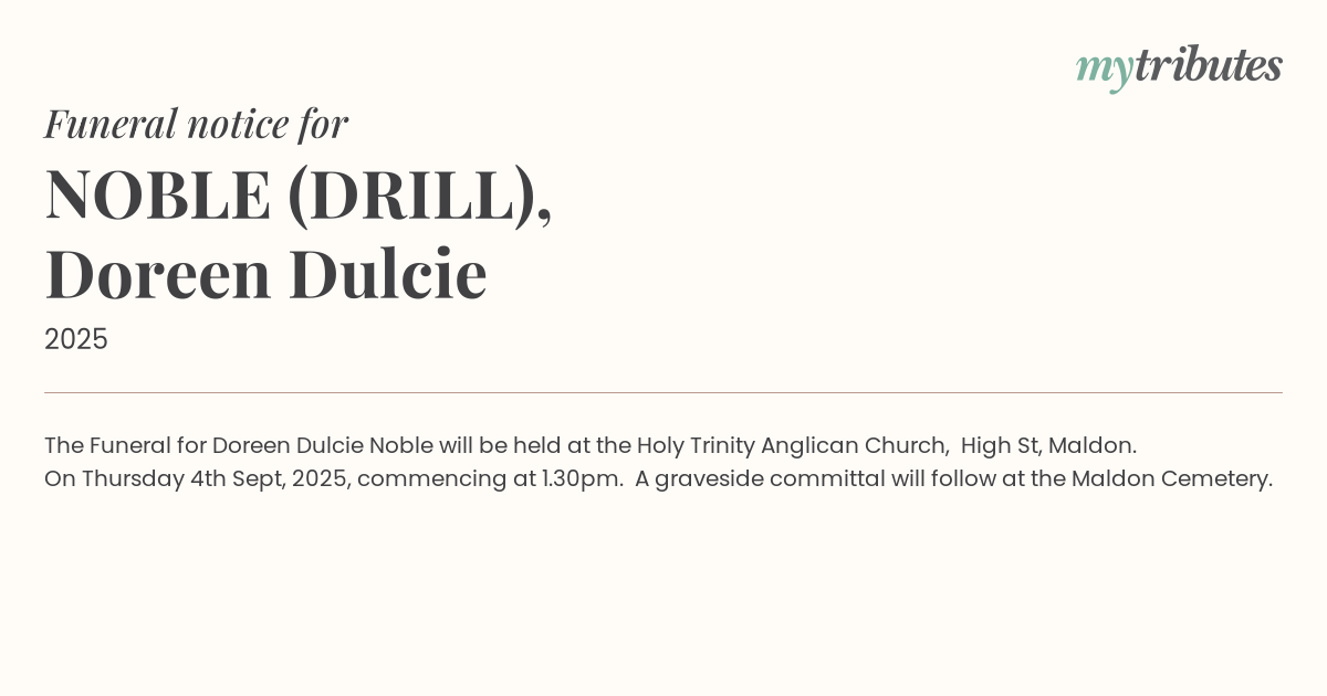 17°CThe Funeral for Doreen Dulcie Noble will be held at the Holy Trinity Anglican Church, High St, Maldon.