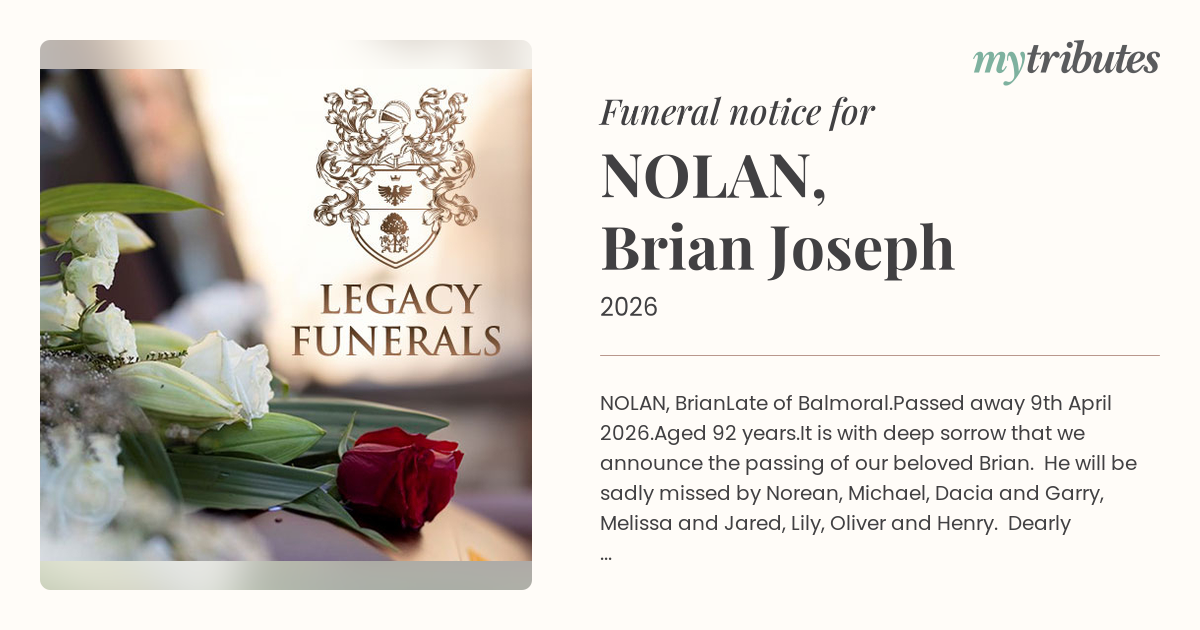 Family and friends are warmly invited to celebrate Brian’s life at a Requiem Mass at St Peter and Pauls Catholic Church, 25 Main Avenue, Balmoral on Monday 20th April at 11 am.