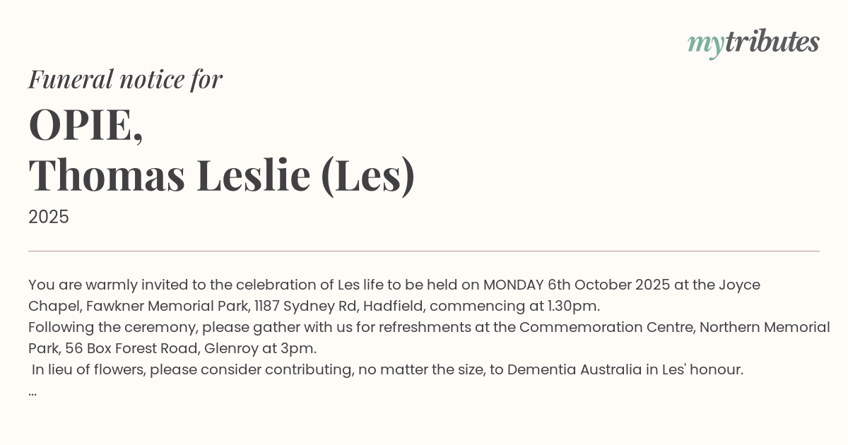 In lieu of flowers, please consider contributing, no matter the size, to Dementia Australia in Les' honour. http://bit.ly/4n0K1zr