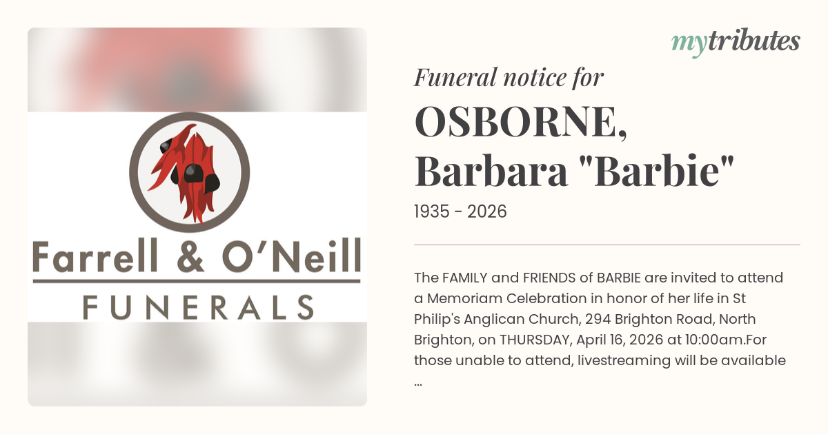 17°CThe FAMILY and FRIENDS of BARBIE are invited to attend a Memoriam Celebration in honor of her life in St Philip's Anglican Church, 294 Brighton Road, North Brighton, on THURSDAY, April 16, 2026 at 10:00am.