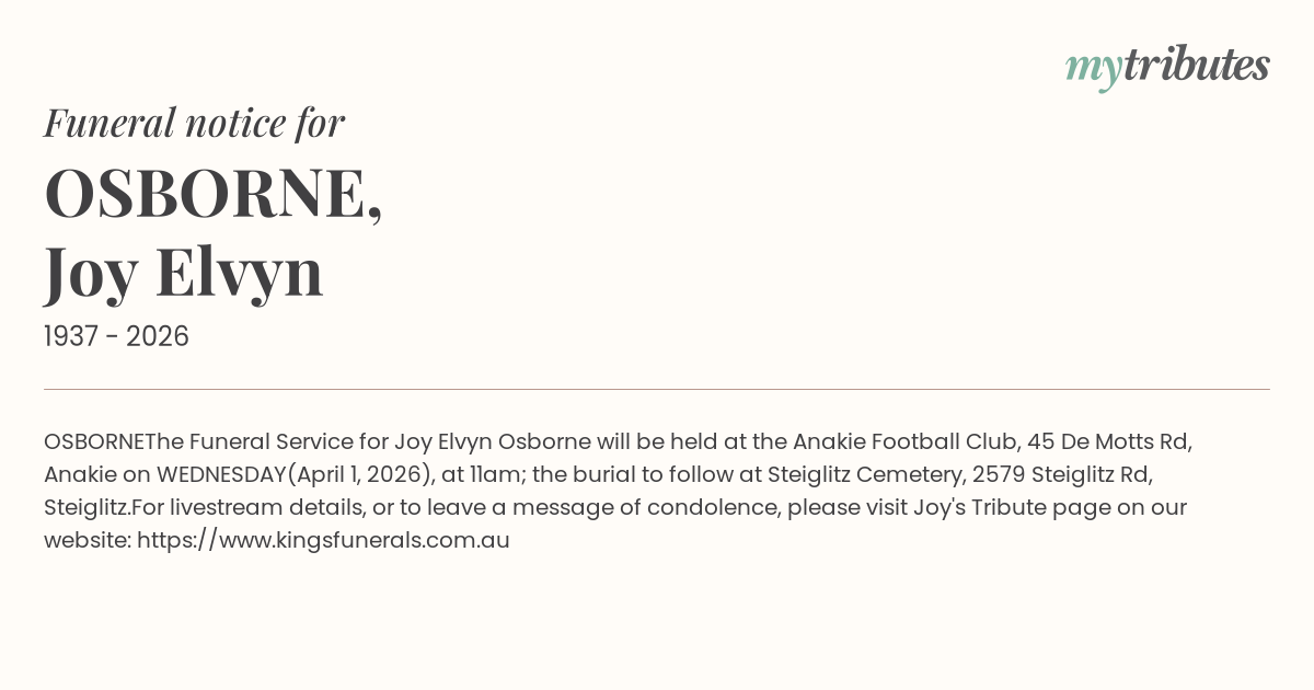 For livestream details, or to leave a message of condolence, please visit Joy's Tribute page on our website: https://www.kingsfunerals.com.au
