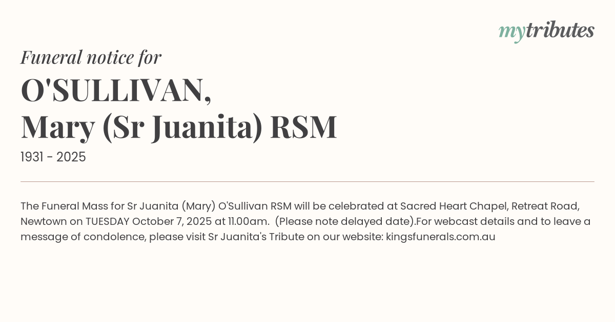 17°CThe Funeral Mass for Sr Juanita (Mary) O'Sullivan RSM will be celebrated at Sacred Heart Chapel, Retreat Road, Newtown on TUESDAY October 7, 2025 at 11.00am.