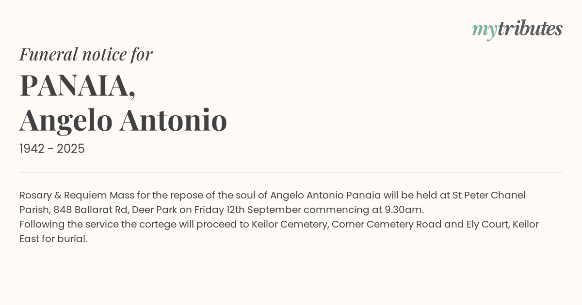 17°CRosary & Requiem Mass for the repose of the soul of Angelo Antonio Panaia will be held at St Peter Chanel Parish, 848 Ballarat Rd, Deer Park on Friday 12th September commencing at 9.30am.