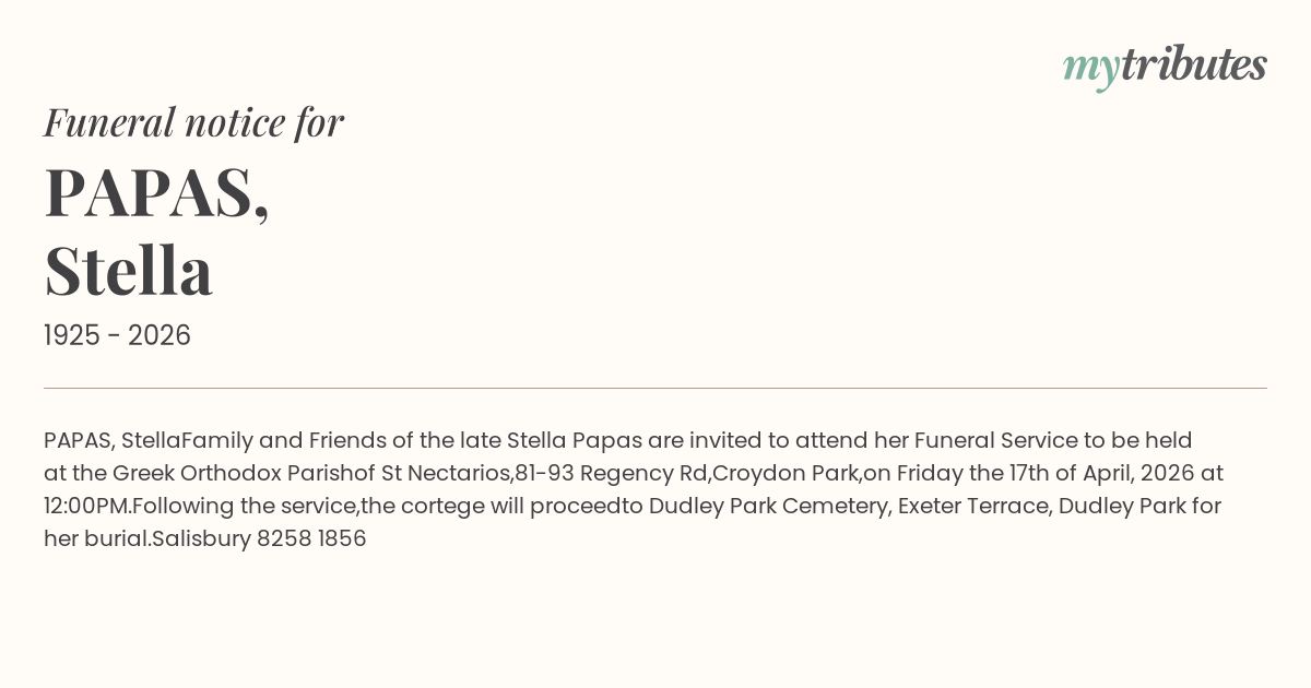 Family and Friends of the late Stella Papas are invited to attend her Funeral Service to be held at the Greek Orthodox Parish
