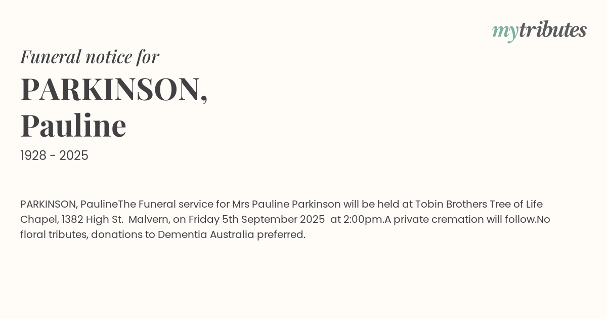 The Funeral service for Mrs Pauline Parkinson will be held at Tobin Brothers Tree of Life Chapel, 1382 High St. Malvern, on Friday 5th September 2025 at 2:00pm.