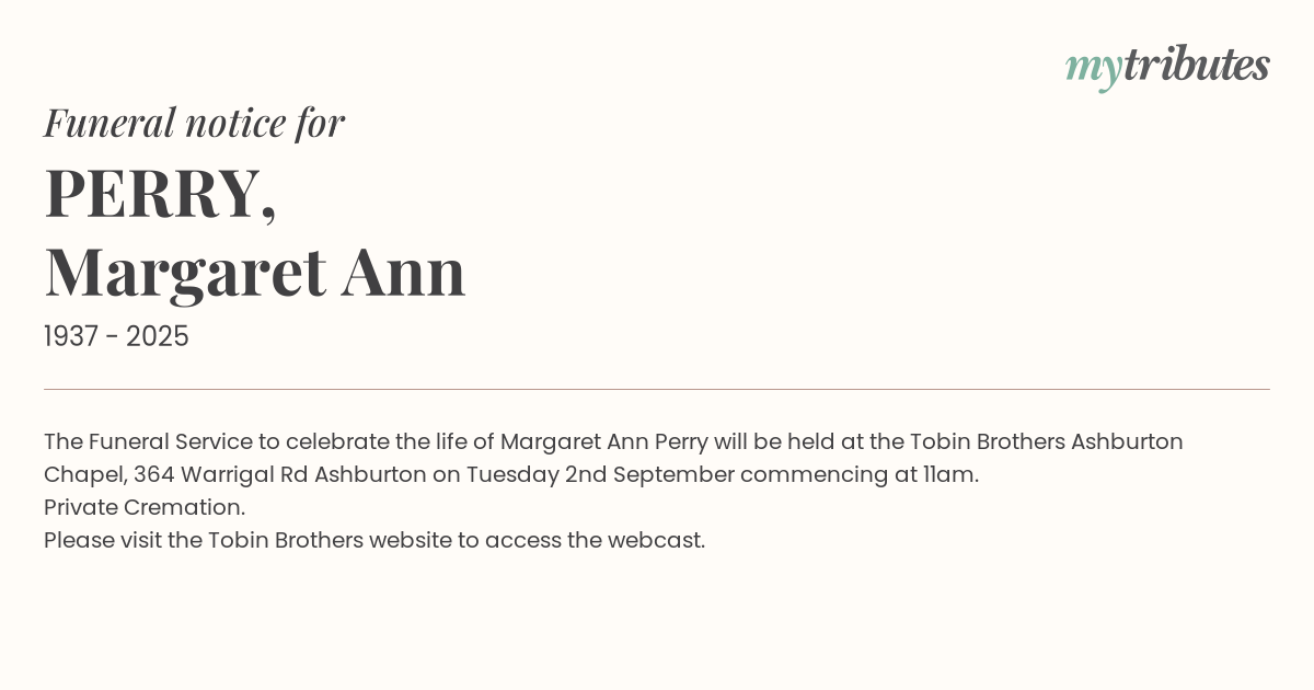 17°CThe Funeral Service to celebrate the life of Margaret Ann Perry will be held at the Tobin Brothers Ashburton Chapel, 364 Warrigal Rd Ashburton on Tuesday 2nd September commencing at 11am.
