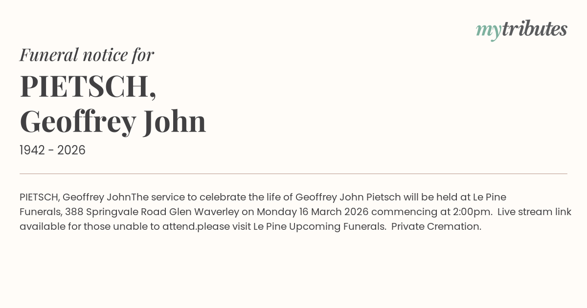 The service to celebrate the life of Geoffrey John Pietsch will be held at