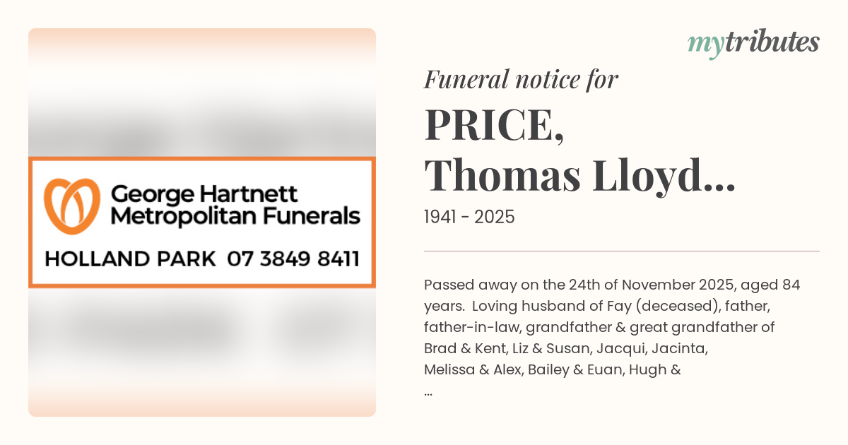 17°CPassed away on the 24th of November 2025, aged 84 years. Loving husband of Fay (deceased), father, father-in-law, grandfather & great grandfather of Brad & Kent, Liz & Susan, Jacqui, Jacinta, Melissa & Alex, Bailey & Euan, Hugh & Bronte. Family and friends are invited to attend the funeral at Mt. Thompson Memorial Gardens - East Chapel at 9.30am on Friday the 5th of December 2025.