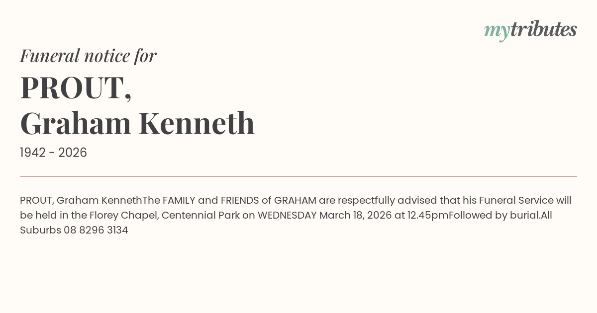 The FAMILY and FRIENDS of GRAHAM are respectfully advised that his Funeral Service will be held in the Florey Chapel, Centennial Park on WEDNESDAY March 18, 2026 at 12.45pm