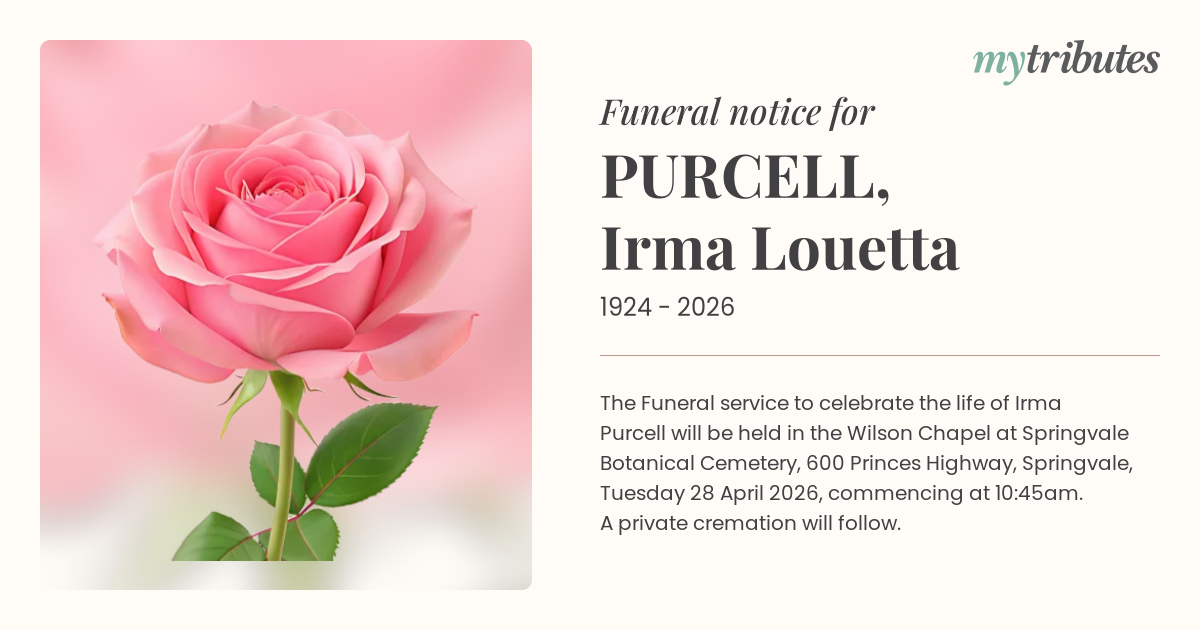 17°CThe Funeral service to celebrate the life of Irma Purcell will be held in the Wilson Chapel at Springvale Botanical Cemetery, 600 Princes Highway, Springvale, Tuesday 28 April 2026, commencing at 10:45am.