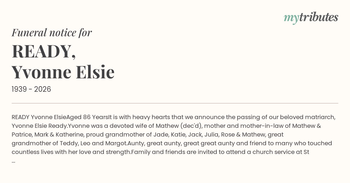 It is with heavy hearts that we announce the passing of our beloved matriarch, Yvonne Elsie Ready.