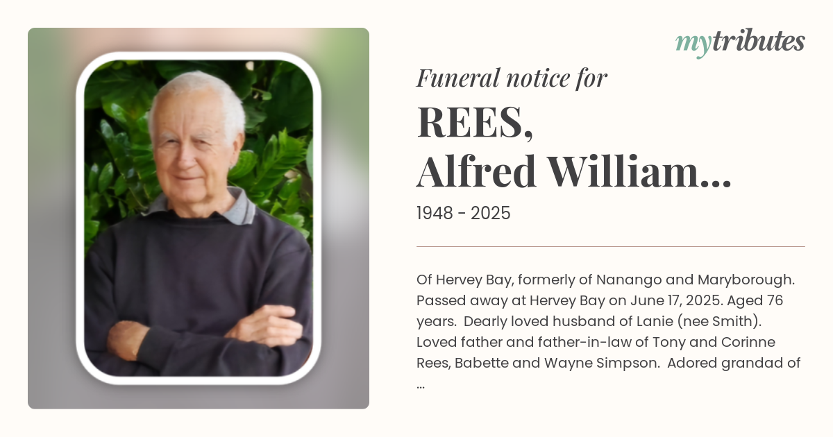 17°COf Hervey Bay, formerly of Nanango and Maryborough. Passed away at Hervey Bay on June 17, 2025. Aged 76 years. Dearly loved husband of Lanie (nee Smith). Loved father and father-in-law of Tony and Corinne Rees, Babette and Wayne Simpson. Adored grandad of Mitchell, Tyler, Braydn and Cal. Loved brother of Ronnie (dec’d), Del, Sel and Shirley.