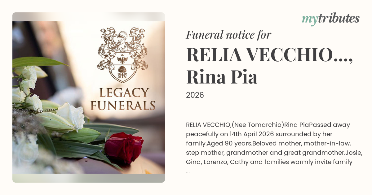 Josie, Gina, Lorenzo, Cathy and families warmly invite family and friends to celebrate Rina's life at Albany Creek Memorial Park, Garden Chapel, 400 Albany Creek Road, Bridgeman Downs, on Thursday 23rd April at 10.30 am, followed by interment at Nudgee Cemetery.