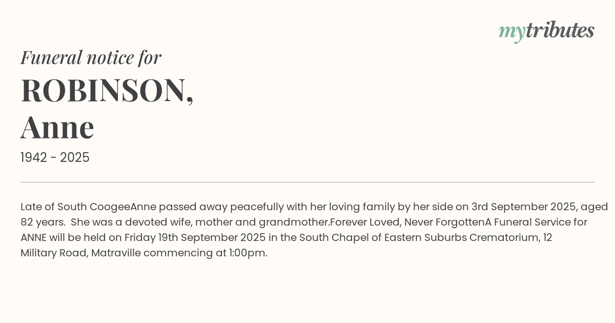 A Funeral Service for ANNE will be held on Friday 19th September 2025 in the South Chapel of Eastern Suburbs Crematorium, 12 Military Road, Matraville commencing at 1:00pm.