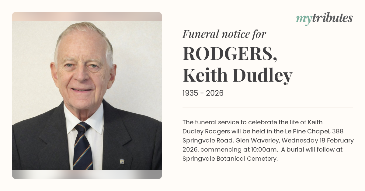 17°CThe funeral service to celebrate the life of Keith Dudley Rodgers will be held in the Le Pine Chapel, 388 Springvale Road, Glen Waverley, Wednesday 18 February 2026, commencing at 10:00am.