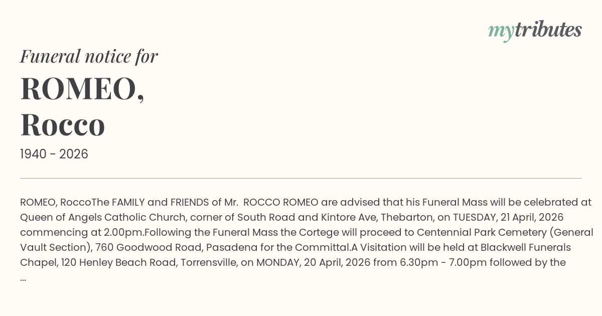 The FAMILY and FRIENDS of Mr. ROCCO ROMEO are advised that his Funeral Mass will be celebrated at Queen of Angels Catholic Church, corner of South Road and Kintore Ave, Thebarton, on TUESDAY, 21 April, 2026 commencing at 2.00pm.