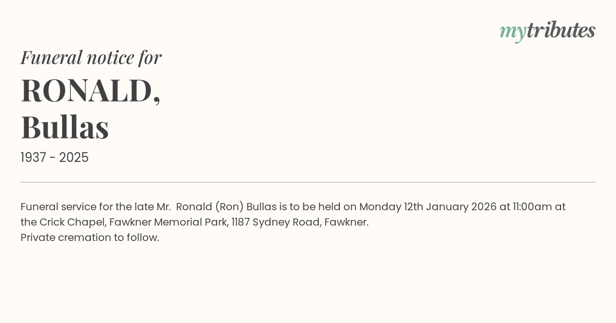 17°CFuneral service for the late Mr. Ronald (Ron) Bullas is to be held on Monday 12th January 2026 at 11:00am at the Crick Chapel, Fawkner Memorial Park, 1187 Sydney Road, Fawkner.