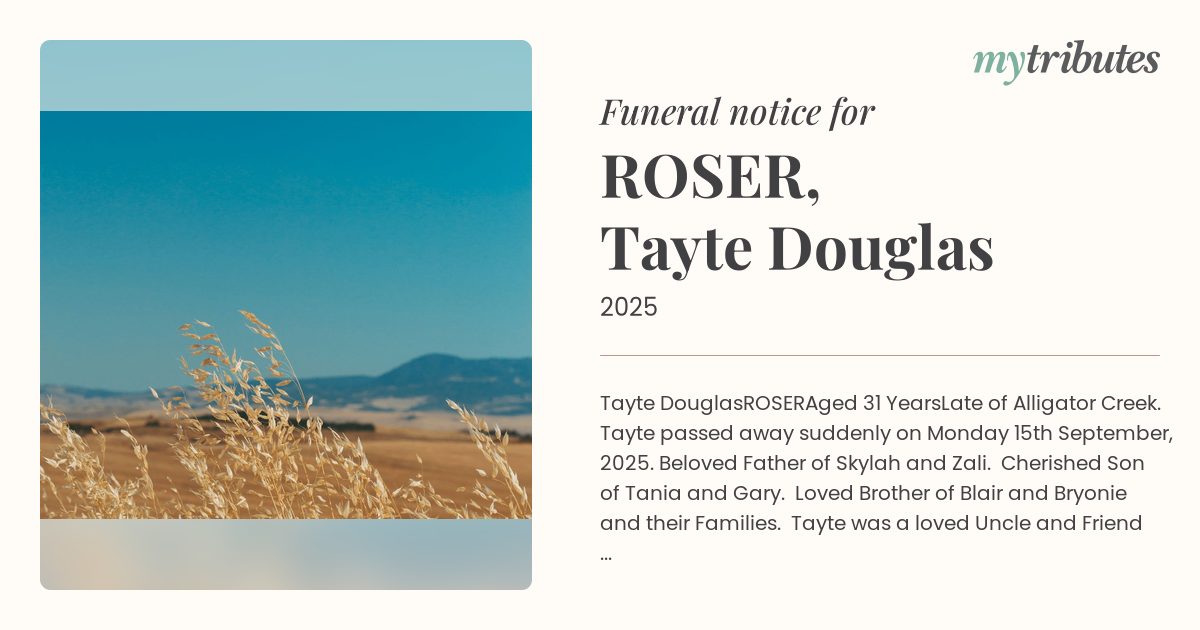 Late of Alligator Creek. Tayte passed away suddenly on Monday 15th September, 2025. Beloved Father of Skylah and Zali. Cherished Son of Tania and Gary. Loved Brother of Blair and Bryonie and their Families. Tayte was a loved Uncle and Friend to many.