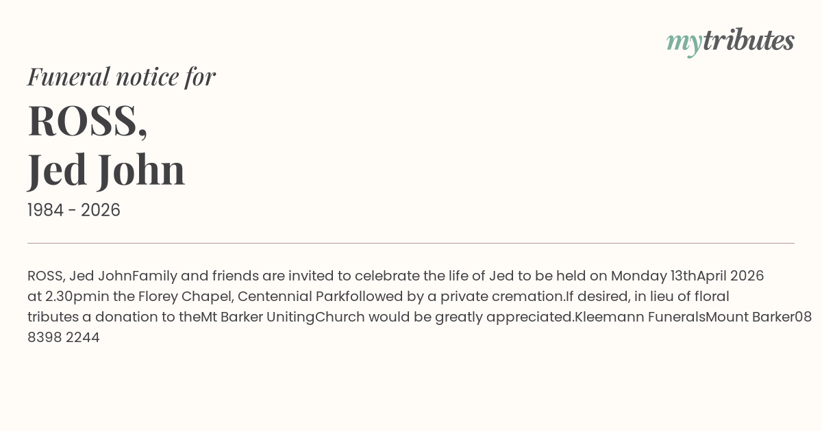 Family and friends are invited to celebrate the life of Jed to be held on Monday 13th