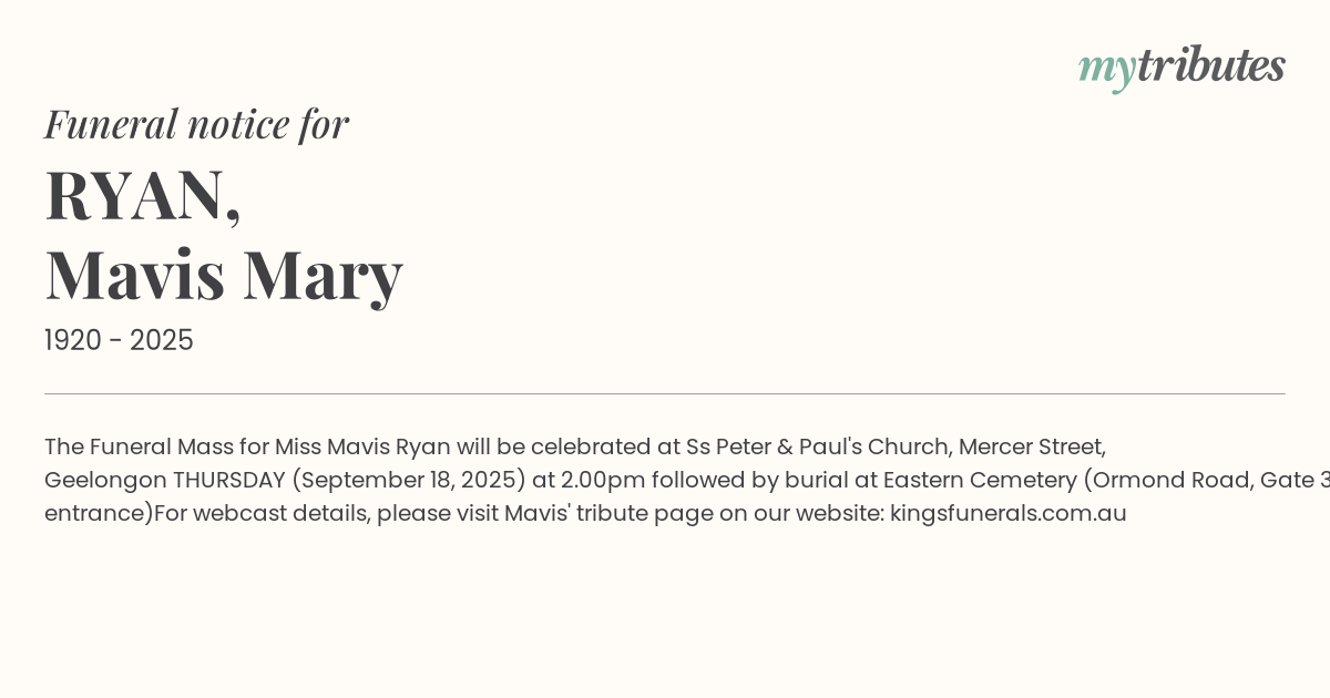 17°CThe Funeral Mass for Miss Mavis Ryan will be celebrated at Ss Peter & Paul's Church, Mercer Street, Geelong