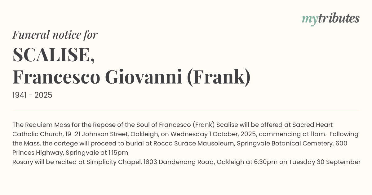 17°CThe Requiem Mass for the Repose of the Soul of Francesco (Frank) Scalise will be offered at Sacred Heart Catholic Church, 19-21 Johnson Street, Oakleigh, on Wednesday 1 October, 2025, commencing at 11am. Following the Mass, the cortege will proceed to burial at Rocco Surace Mausoleum, Springvale Botanical Cemetery, 600 Princes Highway, Springvale at 1:15pm