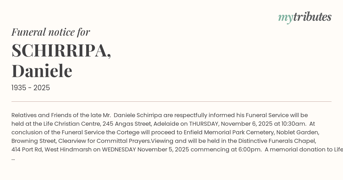 17°CRelatives and Friends of the late Mr. Daniele Schirripa are respectfully informed his Funeral Service will be held at the Life Christian Centre, 245 Angas Street, Adelaide on THURSDAY, November 6, 2025 at 10:30am.