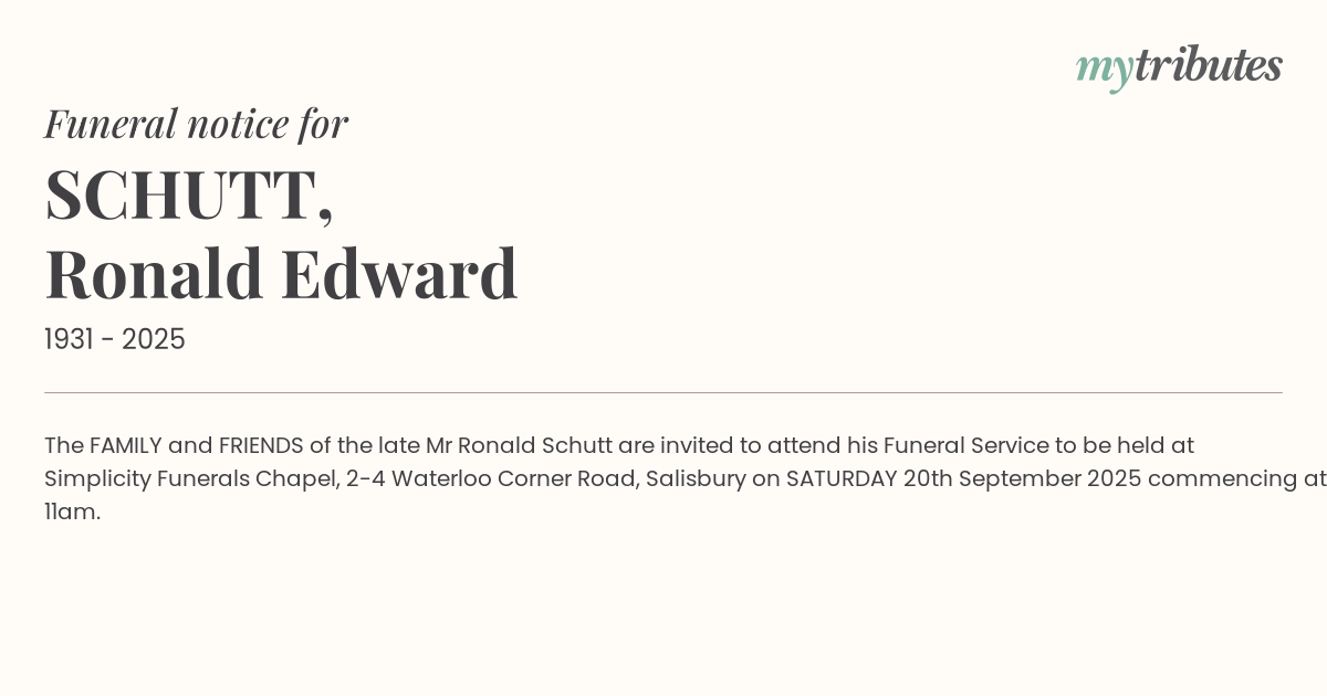 17°CThe FAMILY and FRIENDS of the late Mr Ronald Schutt are invited to attend his Funeral Service to be held at Simplicity Funerals Chapel, 2-4 Waterloo Corner Road, Salisbury on SATURDAY 20th September 2025 commencing at 11am.