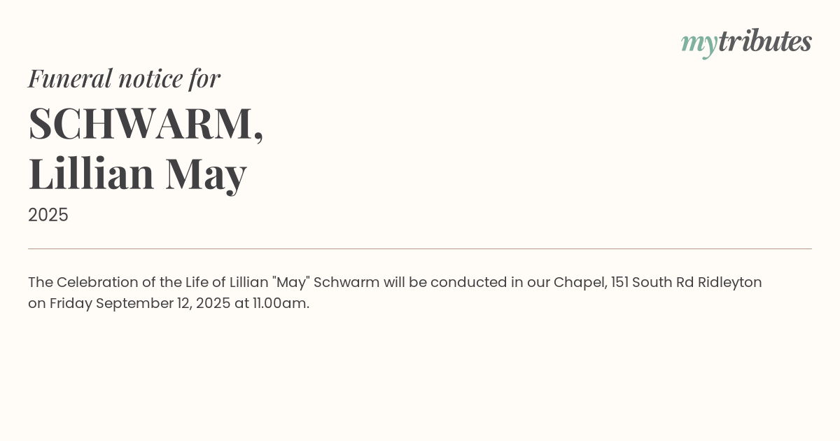 17°CThe Celebration of the Life of Lillian "May" Schwarm will be conducted in our Chapel, 151 South Rd Ridleyton on Friday September 12, 2025 at 11.00am.