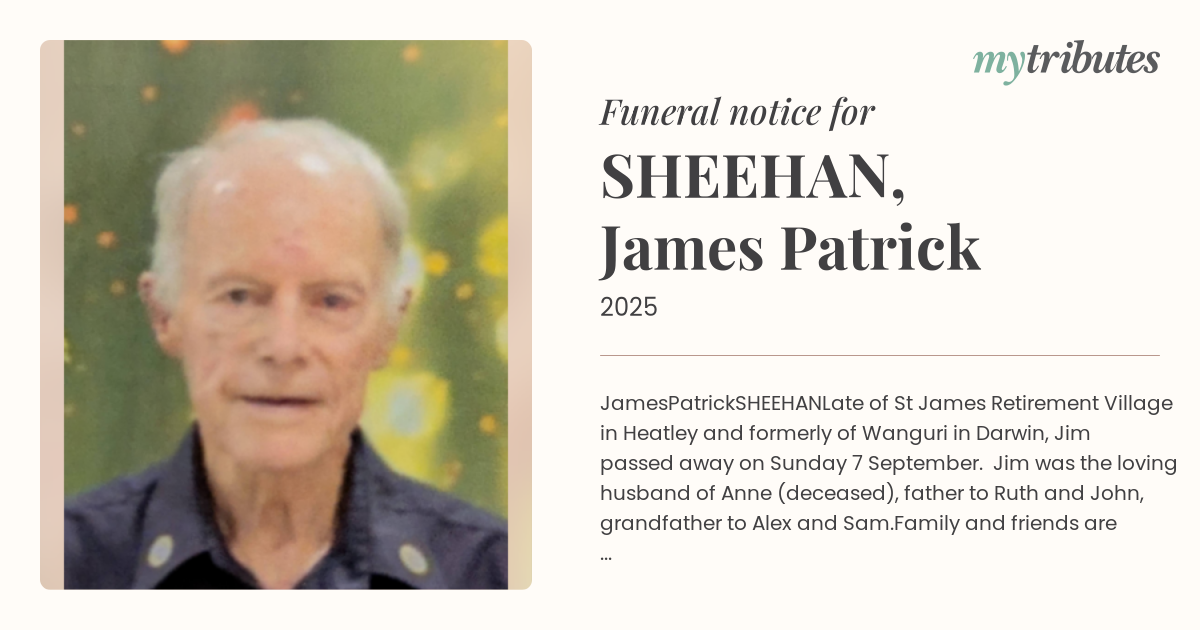 Late of St James Retirement Village in Heatley and formerly of Wanguri in Darwin, Jim passed away on Sunday 7 September. Jim was the loving husband of Anne (deceased), father to Ruth and John, grandfather to Alex and Sam.