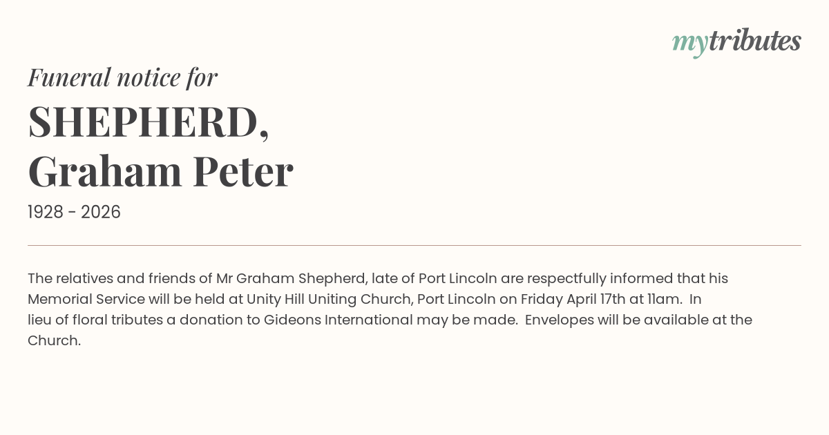 17°CThe relatives and friends of Mr Graham Shepherd, late of Port Lincoln are respectfully informed that his Memorial Service will be held at Unity Hill Uniting Church, Port Lincoln on Friday April 17th at 11am. In lieu of floral tributes a donation to Gideons International may be made. Envelopes will be available at the Church.
