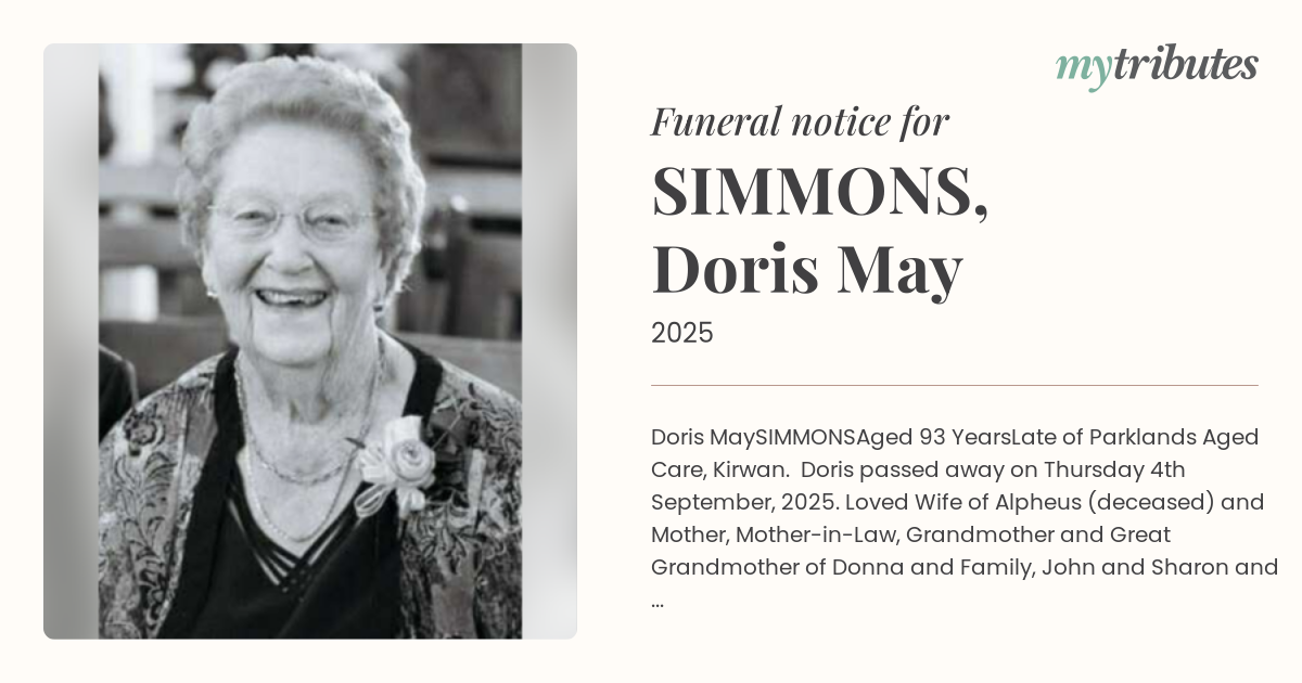 Late of Parklands Aged Care, Kirwan. Doris passed away on Thursday 4th September, 2025. Loved Wife of Alpheus (deceased) and Mother, Mother-in-Law, Grandmother and Great Grandmother of Donna and Family, John and Sharon and Family, Karen and Michael and Family, Lisa and Family, Peter and Madonna and Family. Aunty and great Friend.