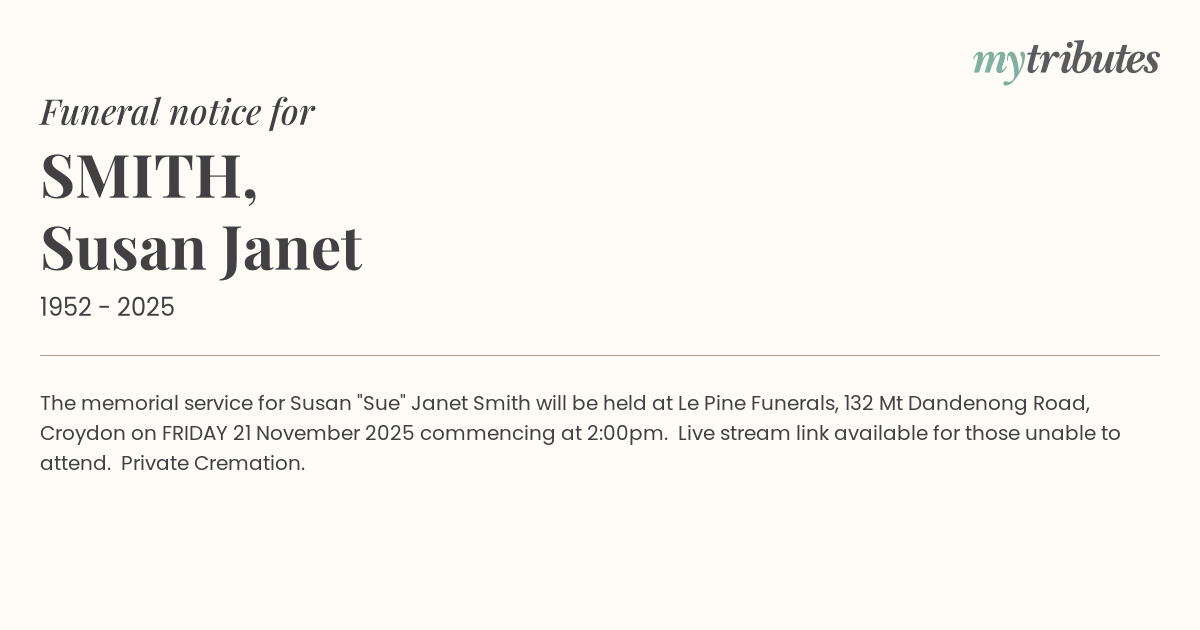 17°CThe memorial service for Susan "Sue" Janet Smith will be held at Le Pine Funerals, 132 Mt Dandenong Road, Croydon on FRIDAY 21 November 2025 commencing at 2:00pm. Live stream link available for those unable to attend. Private Cremation.
