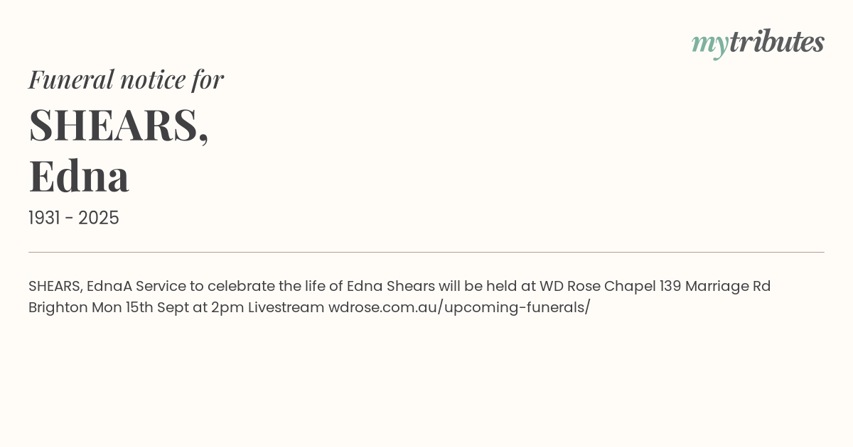 A Service to celebrate the life of Edna Shears will be held at WD Rose Chapel 139 Marriage Rd Brighton Mon 15th Sept at 2pm Livestream wdrose.com.au/upcoming-funerals/
