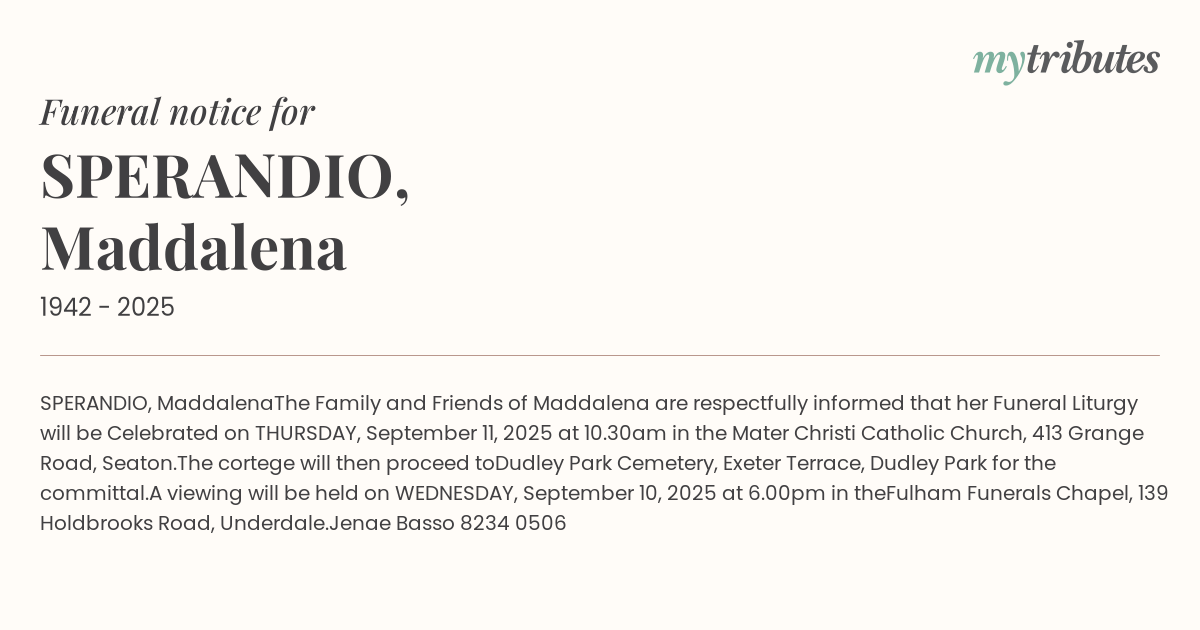 The Family and Friends of Maddalena are respectfully informed that her Funeral Liturgy will be Celebrated on