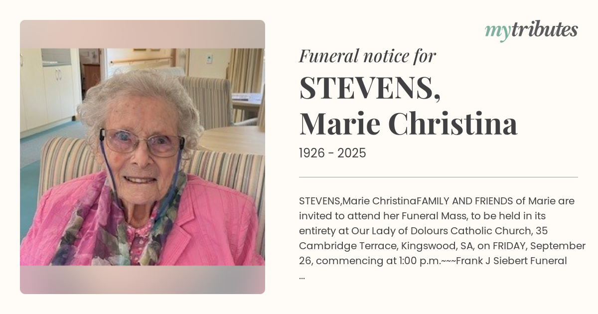 FAMILY AND FRIENDS of Marie are invited to attend her Funeral Mass, to be held in its entirety at Our Lady of Dolours Catholic Church, 35 Cambridge Terrace, Kingswood, SA, on FRIDAY, September 26, commencing at 1:00 p.m.