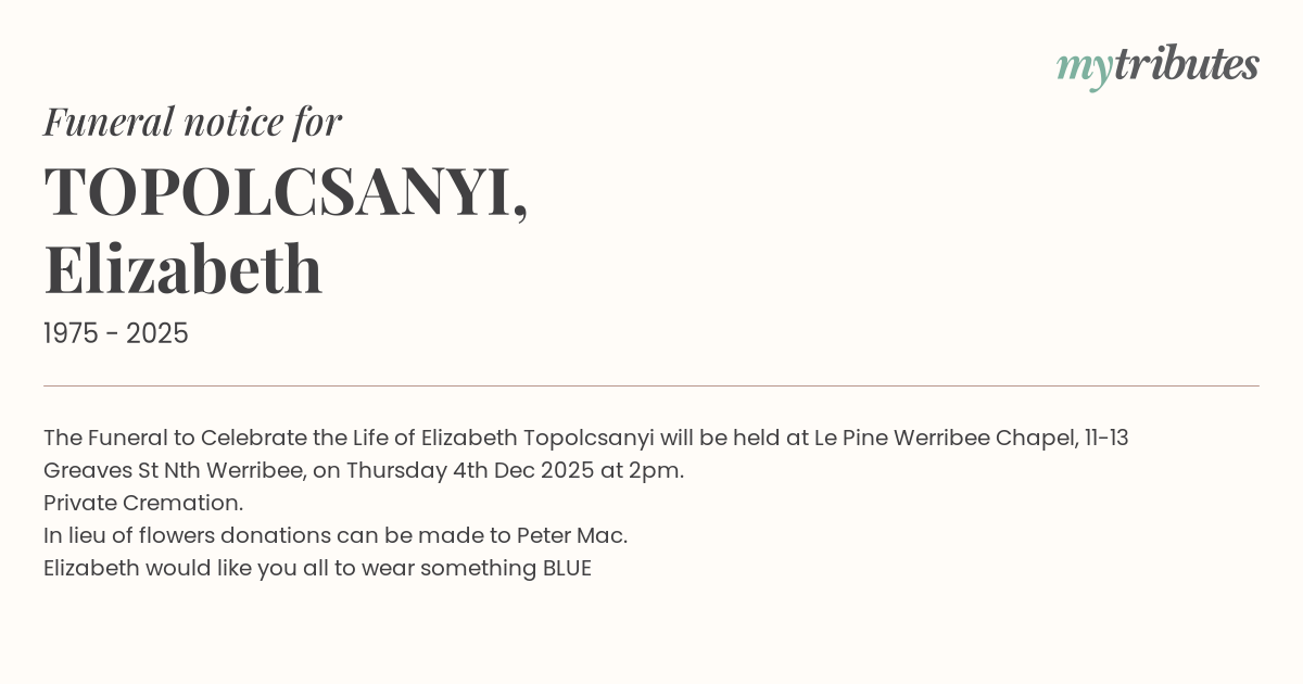 17°CThe Funeral to Celebrate the Life of Elizabeth Topolcsanyi will be held at Le Pine Werribee Chapel, 11-13 Greaves St Nth Werribee, on Thursday 4th Dec 2025 at 2pm.