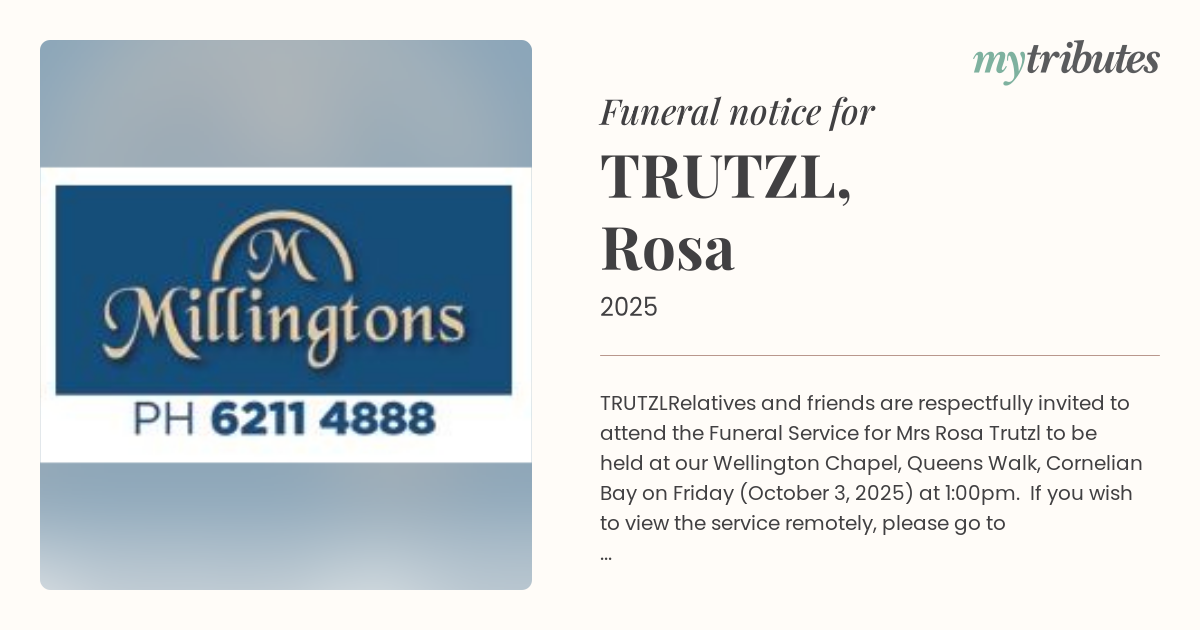 Relatives and friends are respectfully invited to attend the Funeral Service for Mrs Rosa Trutzl to be held at our Wellington Chapel, Queens Walk, Cornelian Bay on Friday (October 3, 2025) at 1:00pm. If you wish to view the service remotely, please go to millingtons.com.au/