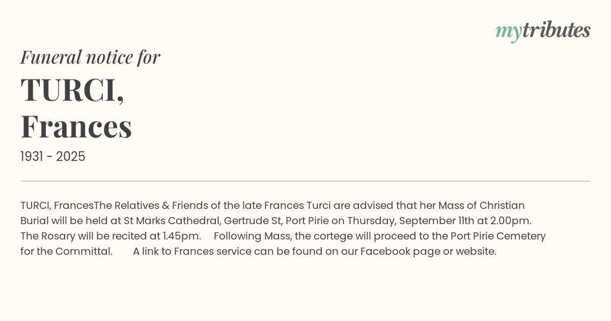The Relatives & Friends of the late Frances Turci are advised that her Mass of Christian Burial will be held at St Mark’s Cathedral, Gertrude St, Port Pirie on Thursday, September 11th at 2.00pm.