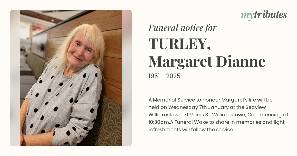 17°CA Memorial Service to honour Margaret's life will be held on Wednesday 7th January at the Seaview Williamstown, 71 Morris St, Williamstown, Commencing at 10:30am.
