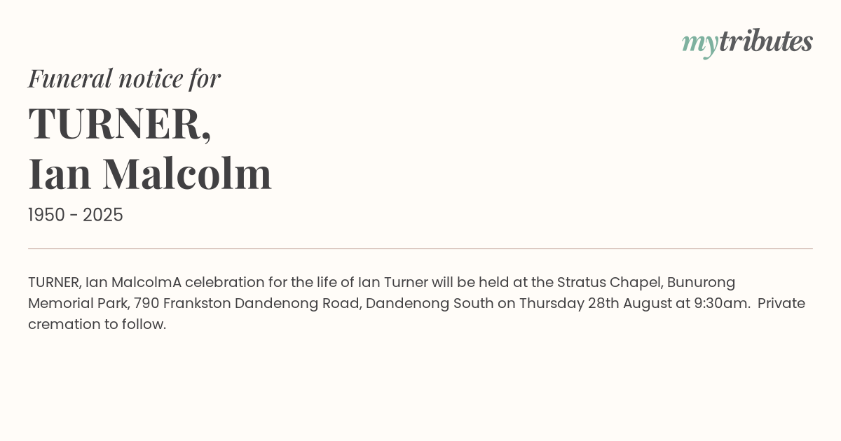 A celebration for the life of Ian Turner will be held at the Stratus Chapel, Bunurong Memorial Park, 790 Frankston Dandenong Road, Dandenong South on Thursday 28th August at 9:30am.