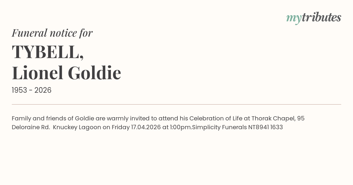 17°CFamily and friends of Goldie are warmly invited to attend his Celebration of Life at Thorak Chapel, 95 Deloraine Rd. Knuckey Lagoon on Friday 17.04.2026 at 1:00pm.