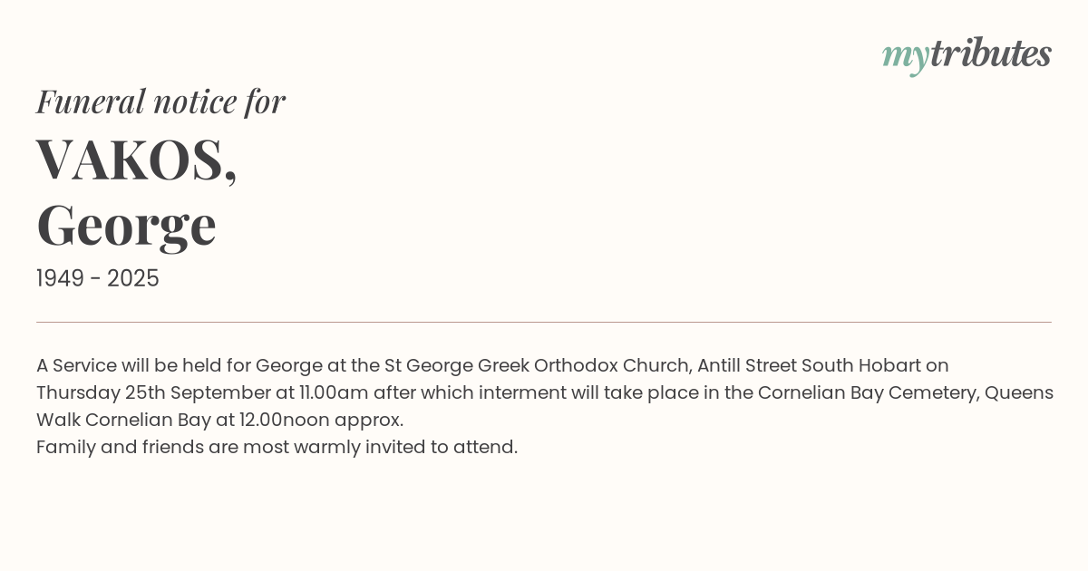 17°CA Service will be held for George at the St George Greek Orthodox Church, Antill Street South Hobart on Thursday 25th September at 11.00am after which interment will take place in the Cornelian Bay Cemetery, Queens Walk Cornelian Bay at 12.00noon approx.