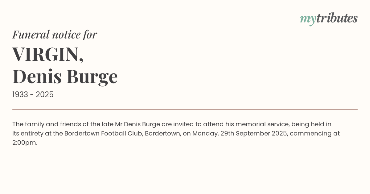 17°CThe family and friends of the late Mr Denis Burge are invited to attend his memorial service, being held in its entirety at the Bordertown Football Club, Bordertown, on Monday, 29th September 2025, commencing at 2:00pm.