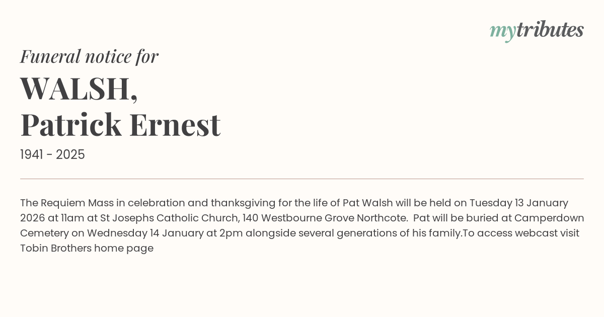 17°CThe Requiem Mass in celebration and thanksgiving for the life of Pat Walsh will be held on Tuesday 13 January 2026 at 11am at St Joseph’s Catholic Church, 140 Westbourne Grove Northcote. Pat will be buried at Camperdown Cemetery on Wednesday 14 January at 2pm alongside several generations of his family.