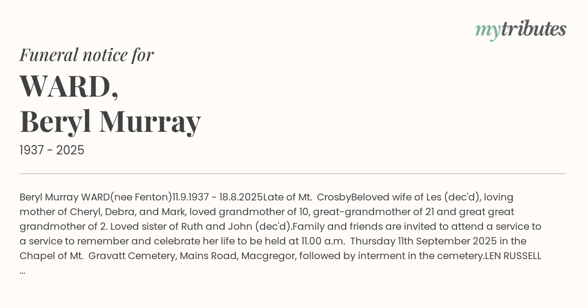 Family and friends are invited to attend a service to a service to remember and celebrate her life to be held at 11.00 a.m. Thursday 11th September 2025 in the Chapel of Mt. Gravatt Cemetery, Mains Road, Macgregor, followed by interment in the cemetery.