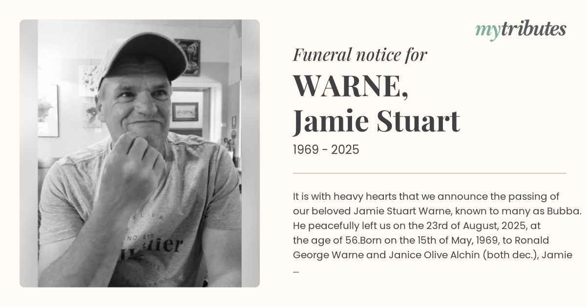 17°CIt is with heavy hearts that we announce the passing of our beloved Jamie Stuart Warne, known to many as Bubba. He peacefully left us on the 23rd of August, 2025, at the age of 56.