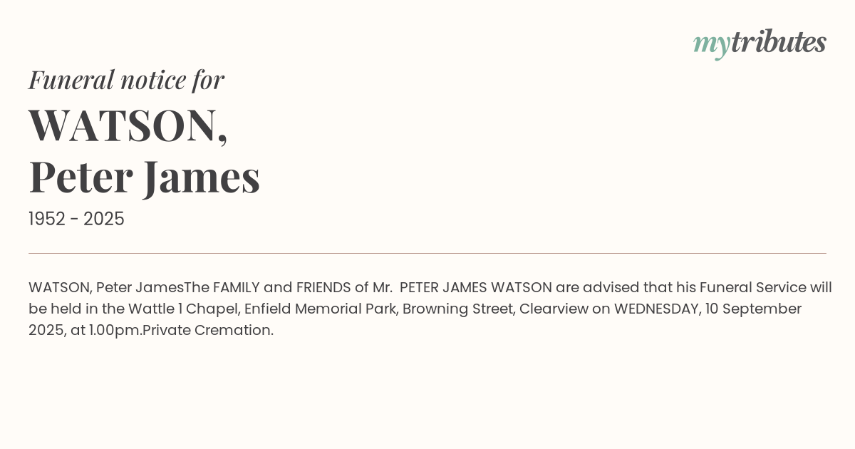 The FAMILY and FRIENDS of Mr. PETER JAMES WATSON are advised that his Funeral Service will be held in the Wattle 1 Chapel, Enfield Memorial Park, Browning Street, Clearview on WEDNESDAY, 10 September 2025, at 1.00pm.